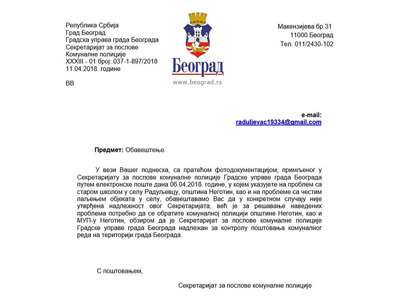 Kako se navodi na fejsbuk stranici Radujevac R Radujevac, meštani ove mesne zajednice su rešenje potražili u Gradskoj upravi grada Beograda, u sekretarijatu za poslove Komunalne policije. U obaveštenju iz ovog sekretarijata navode da Gradska uprava grada Beograda povodom slučaja paljenja objekata i ruiniranje škole nije nadležna na teritoriji opštine Negotin, već samo na području grada Beograda.