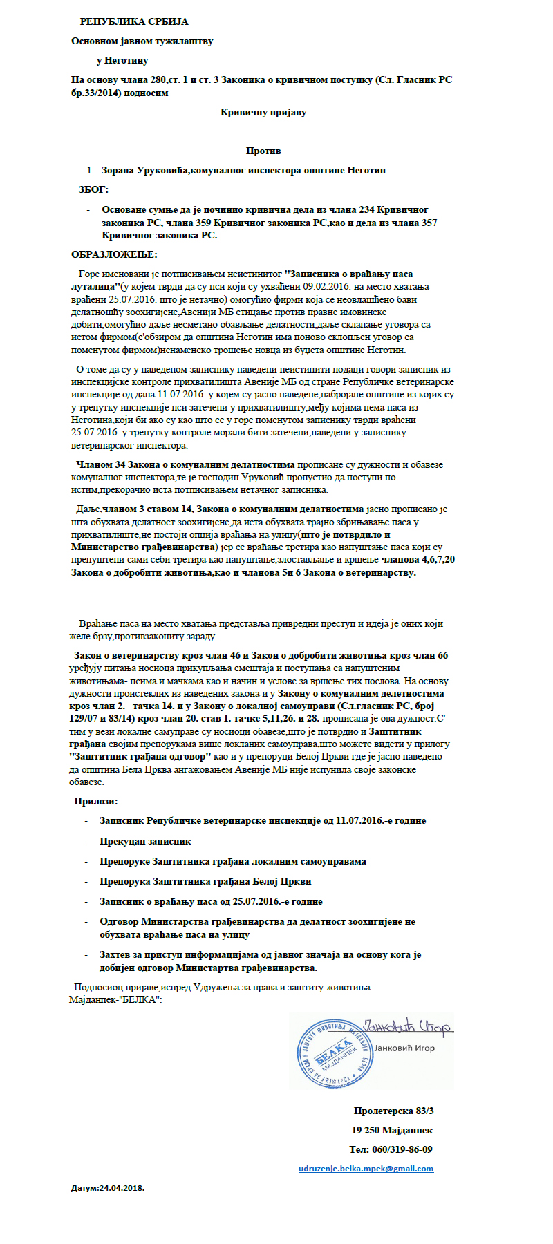 Ovo udruženje je 24. aprila podnelo krivičnu prijavu protiv gorepomenutog inspektora zbog osnovane sumnje da je falsifikovao službenu ispravu i zloupotrebio službeni položaj.