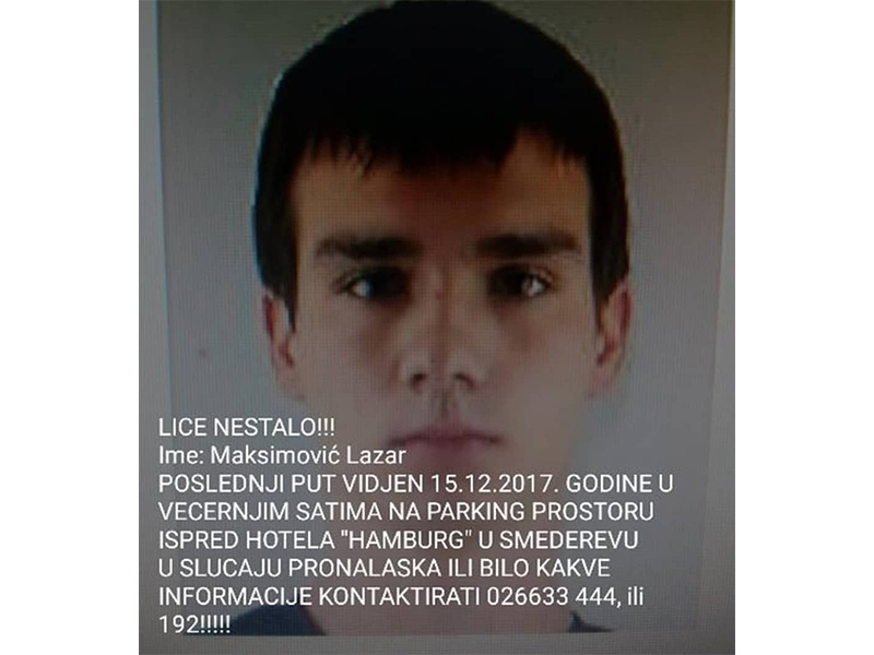 Lazar Maksimović je poslednji put viđen 15.12.2017. godine u večernjim satima na parking prostoru ispred hotela ''Hamburg'' u Smederevu.
