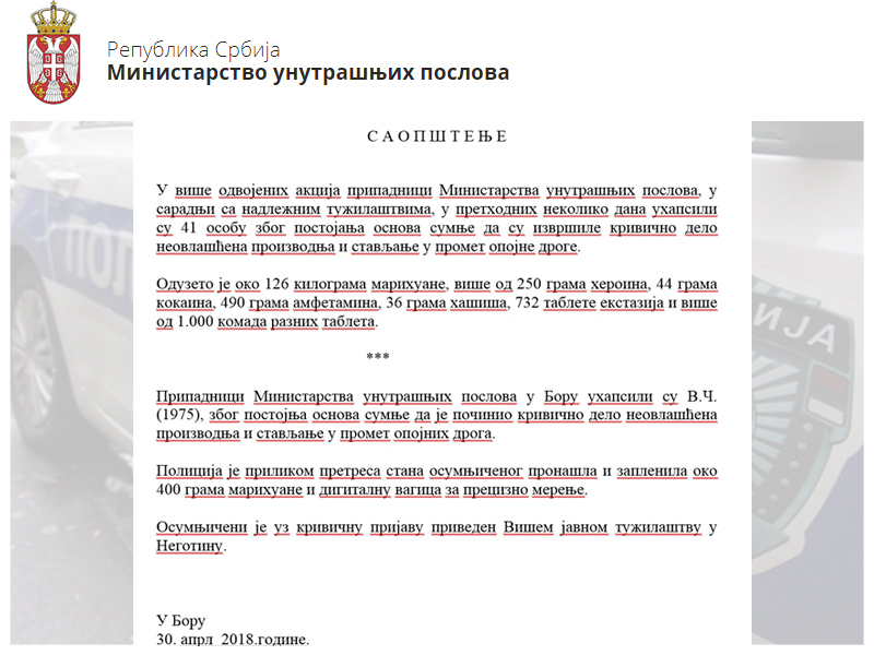 Na vest o hapšenju 41 osobe zbog postojanja osnova sumnje da su izvršile krivično delo neovlašćena proizvodnja i stavljanje u promet opojne droge, prenosimo zvanično saopštenje.