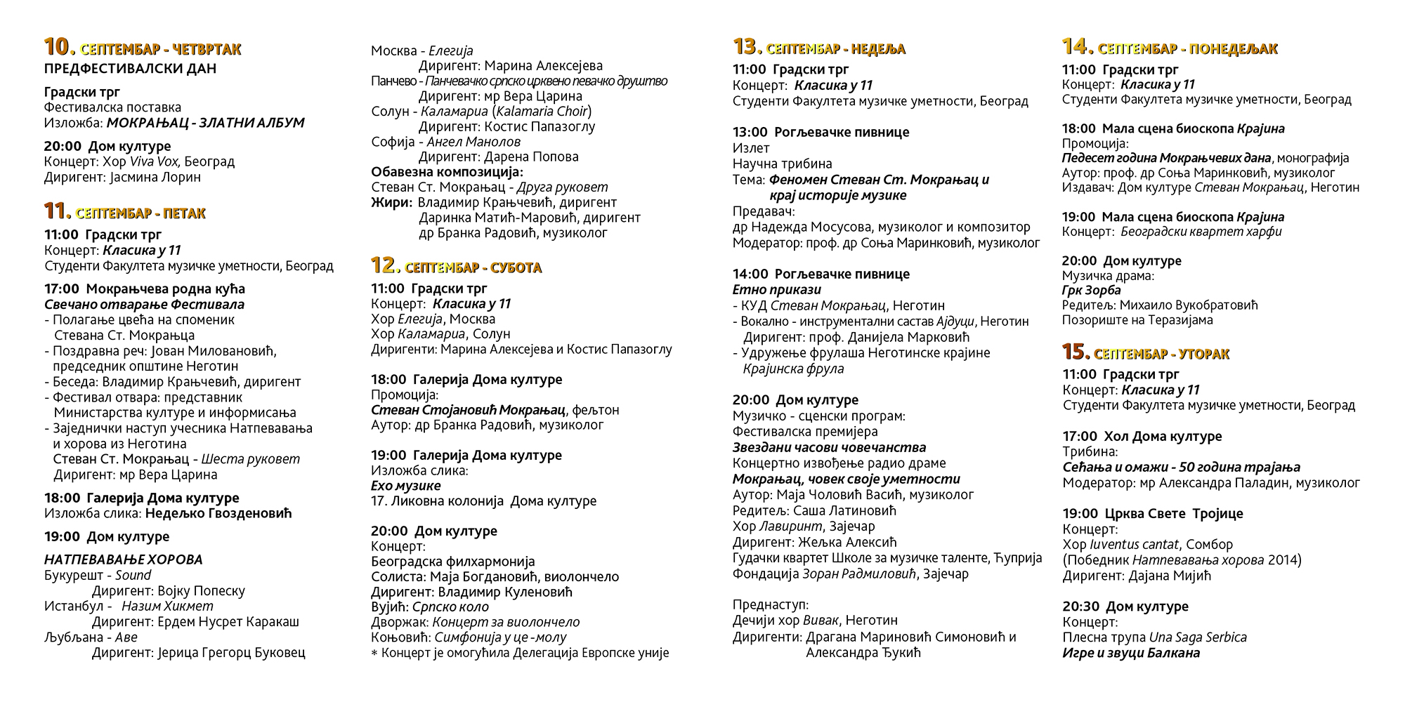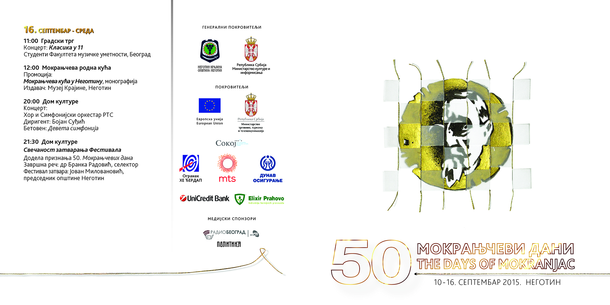 Pedeseti, jubilarni Festival "Mokranjčevi dani", u rodnom gradu muzičkog velikana Stevana Stojanovića Mokranjca, kao centralna kulturna manifestacija u Srbiji, biće organizovan od 10. do 16. septembra, uz generalno pokroviteljstvo Opštine Negotin i Ministarstva kulture i informisanja Republike Srbije. Pokrovitelji su: Delegacija Evropske unije, Ministarstvo trgovine, turizma i telekomunikacija RS, Sokoj, Ogranak HE Đerdap, MTS, Dunav osiguranje, UniCredit Banka i Elixir Prahovo.