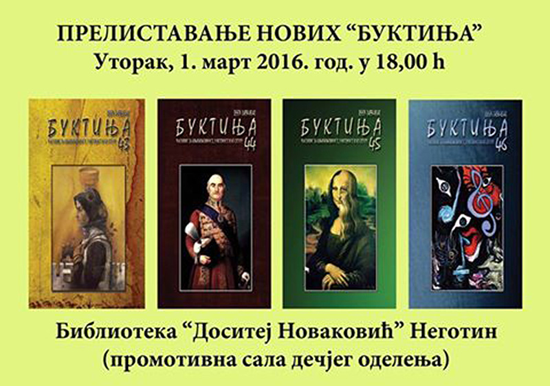 Autor Jovanka StanojevićIzložbama i radionicom „Knjiga“, Narodna biblioteka „Dositej Novaković“ u Negotinu, obeležila je 28. februar, Nacionalni dan knjige. Već za 1. mart najavljen je još jedan program, a biće to prelistavanje novih „Bukinja“, u promotivnoj sali Dečijeg odeljenja od 18 sati.
