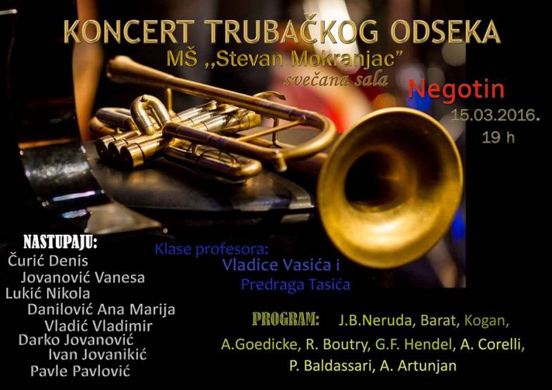 Prvi od dva planirana koncerta učenika trubačkog odseka biće priređen u ponedeljak, 14. marta, u koncertnoj sali Biblioteke „Centar za kulturu“ Kladovo, od 18 sati. Dan kasnije, u utorak 15. marta, u svečanoj Sali Muzičke škole „Stevan Mokranjac“ u Negotinu, muzički megdan počeće u 19 sati.