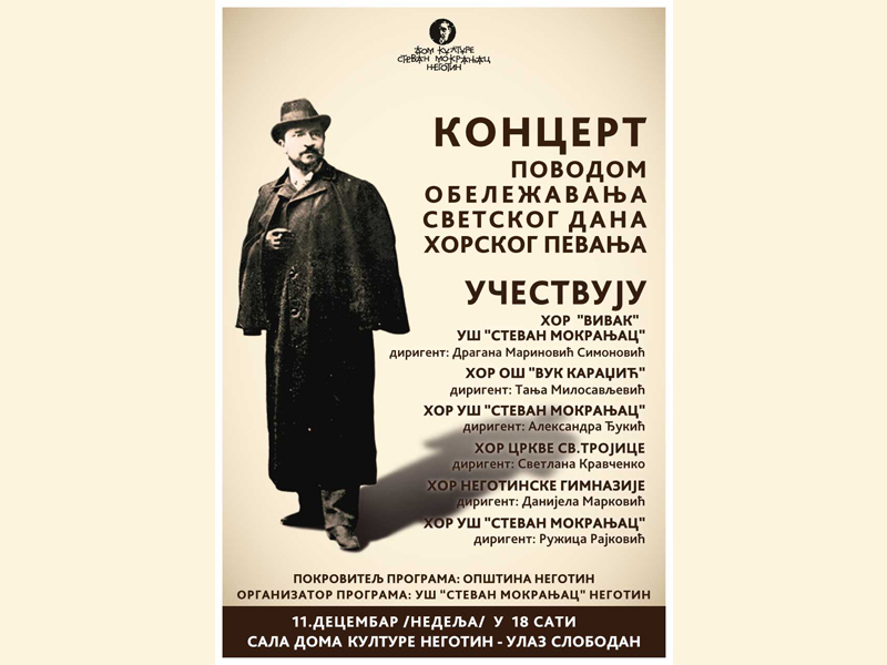 Autor Jovanka StanojevićNegotin se i ove godine uključuje u obeležavanje Svetskog dana horskog pevanja. U nedelju, 11. decembra koncert tim povodom organizuje Umetnička škola „Stevan Mokranjac“ od 18 časova na velikoj sceni Doma kulture, pod pokroviteljstvom Opštine