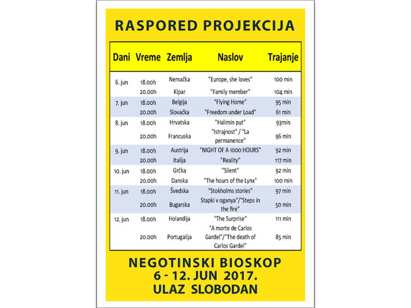 U ovogodišnjoj selekciji Festivala evropskog filma (FEF) su ostvarenja savremene produkcije Danske, Portugala, Austrije, Belgije, Grčke, Francuske, Hrvatske, Italije, Holandije, Bugarske, Švedske, Slovačke, Kipra i Nemačke. Sve projekcije u negotinskom Bioskopu „Krajina“, od 6. do 12. juna biće besplatne, a organizatori su nam dostavili i program Festivala, koji je već održan u nekoliko srpskih gradova.