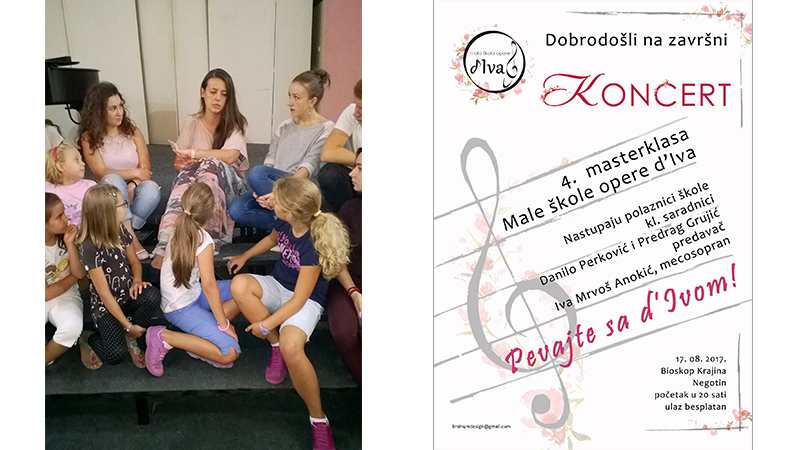 Budući solo pevači i ljubitelji umetničke muzike, uzrasta od 4 do 23 godine, vredno su radili punih deset dana, nadahnuti ličnim i entuzijazmom svoje mentorke i predavača u Maloj školi opere d'Iva, kako se od ove godine zove nekadašnja Letnja škola pevanja Ive Mrvoš Anokić, mecosoprana, veoma talentovane i u Evropi već afirmisane mlade umetnice. U odnosu na ideju koja je rođena pre pet, škola se organizuje četiri godine i već je na putu svog prvog malog jubileja, s obzirom da sigurno i uspešno postaje tradicija Negotina, grada bogate kulture, umetnosti, pevanja, rodnog mesta znamenitog Mokranjca.