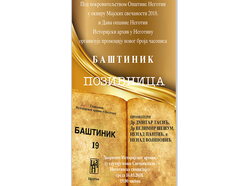 Povodom Dana opštine Negotin, a u okviru „Majskih svečanosti“, u sredu će od 19 sati biti promovisan časopis „Baštinik“. O novom „Baštiniku“ govoriće dr Dmitar Tasić i dr Velimir Šešum.