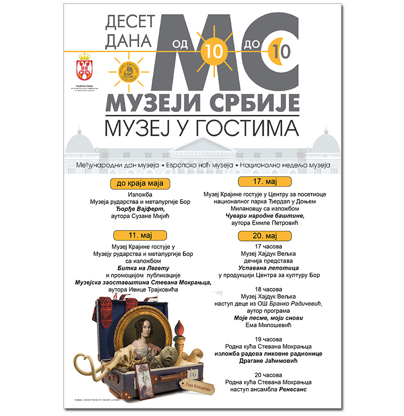 Manifestacija „Muzeji Srbije, deset dana od 10 do 10 – Muzej u gostima“, otvorena u Negotinu Izložbom Muzeja rudarstva i metalurgije Bor „Đorđe Vajfert“, autora Suzane Mijić, trajaće do 20. maja. U okviru tog termina biće obeležena Nacionalna nedelja muzeja, Međunarodni dan muzeja, 18. maj i Evropska noć muzeja, 20. maj