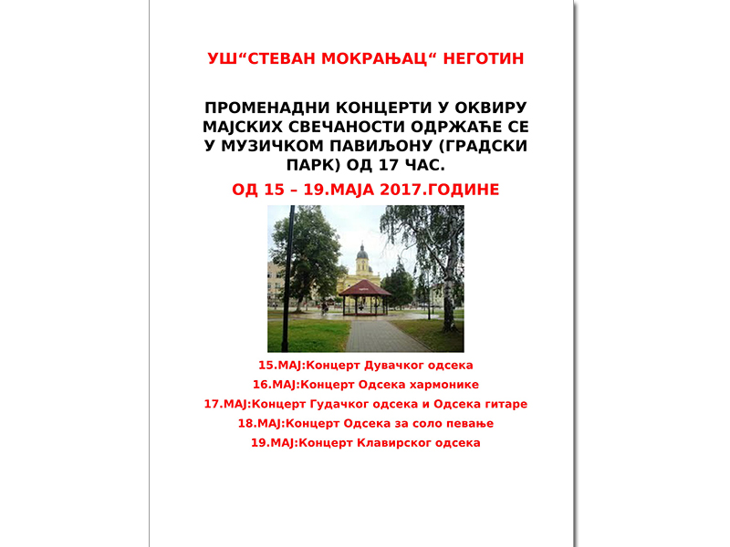 Učenici i nastavnici Umetničke škole „Stevan Mokranjac“, svojim programima, uključili su se u ovogodišnje Majske svečanosti. Počev od danas u 17 sati do 19. maja u centru grada promenadne koncerte prirediće duvački, odsek harmonike, gudački i odsek gitare, solo pevanja, a nastupiće i učenici sa klavirskog odseka