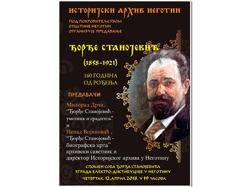 U organizaciji Istorijskog arhiva u Negotinu a povodom 160 godina od rođenja slavnog umetnika i graditelja, našeg sugrađanina Đorđa Stanojevića, biće priređeno predavanje o životu i radu ovog značajnog čoveka, sa početkom u 19 časova u zgradi Elektrodistribucije. Kratku biografiju o njemu će ispričati Nenad Vojinović, direktor Arhiva u Negotinu, a predavanje će vršiti gospodin Milorad Drča.