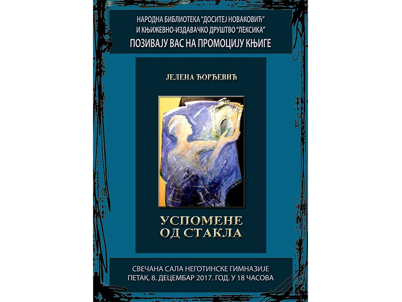 U organizaciji Narodne biblioteke “Dositej Novaković” i književno izdavačkog društva “Leksika”, u petak, 8. decembra 2017. godine u 18 sati, u svečanoj sali Negotinske gimnazije biće priređena promocija knjige pesama “Uspomene od stakla”, Jelene Đorđević, bivše učenice Gimnazije i studenta Srbistike na Filozofskom fakultetu u Nišu.