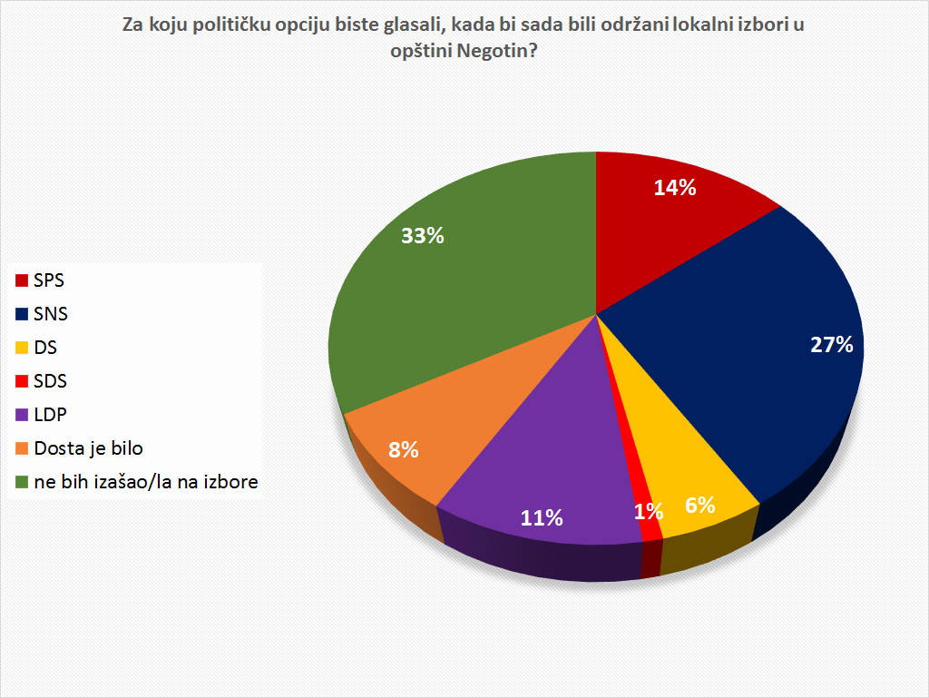 Autor Predrag BalaneskovićZavršena je još jedna anketa na East Side portalu, a anketno pitanje je glasilo "Za koju političku opciju biste glasali, kada bi sada bili održani lokalni izbori u opštini Negotin?". Dobijeni rezultati su manje-više bili očekivani, ali ono što brine je veliki broj onih koji su odgovorili da ne bi izašli na izbore, čime se pokazuje veliko nepoverenju u ponuđene političke opcije odrađene ankete.