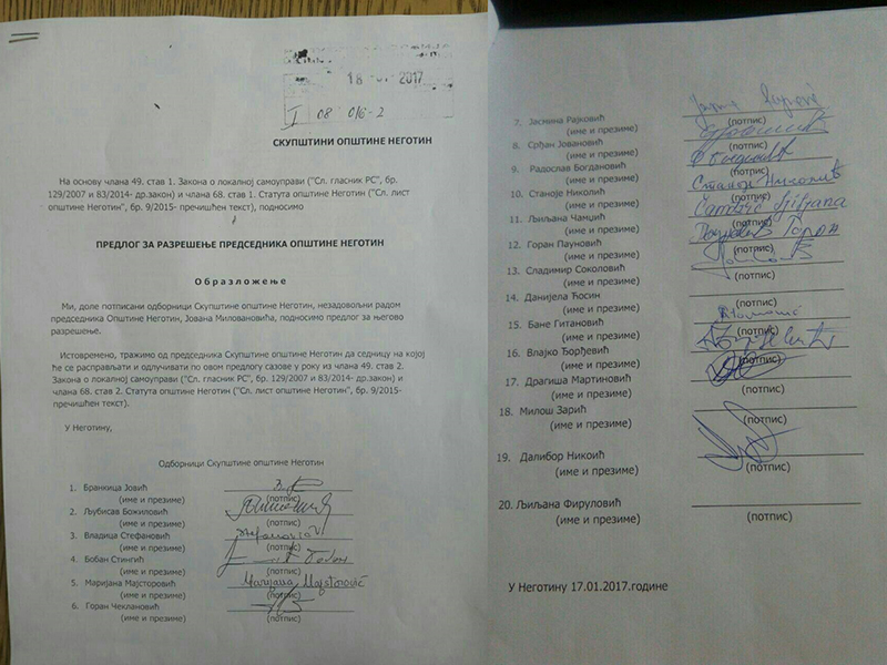 Društvenim mrežama uveliko kruži overena izjava odbornika koji traže smenu Jovana Milovanovića, predata 18.januara na pisarnici Opštine Negotin, a da je stigla na traženu adresu potvrdio je jedino doktor medicine Ljubisav Božilović, predsednik Skupštine opštine Negotin.
