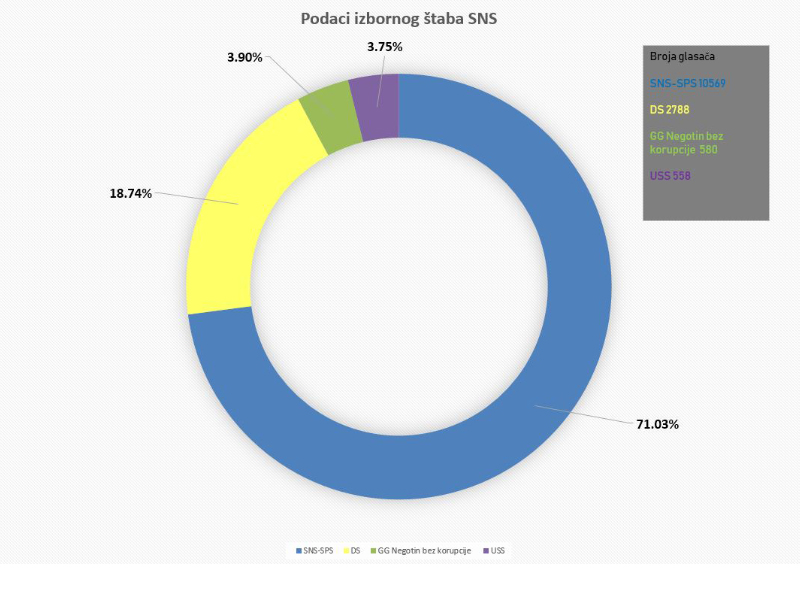 Koalicija SNS-SPS je dobila 10569 glasova, DS 2788 glasova, GG Negotin bez korupcije 580 i USS 558 glasova.