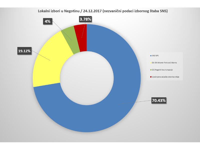 Na vanrednim lokalnim izborima u Negotinu, održanim 24. decembra prema prvim rezultatima kojima raspolažemo pobedu je odnela koalicija SNS-SPS, koja će imati najviše mesta u lokalnom parlamentu.