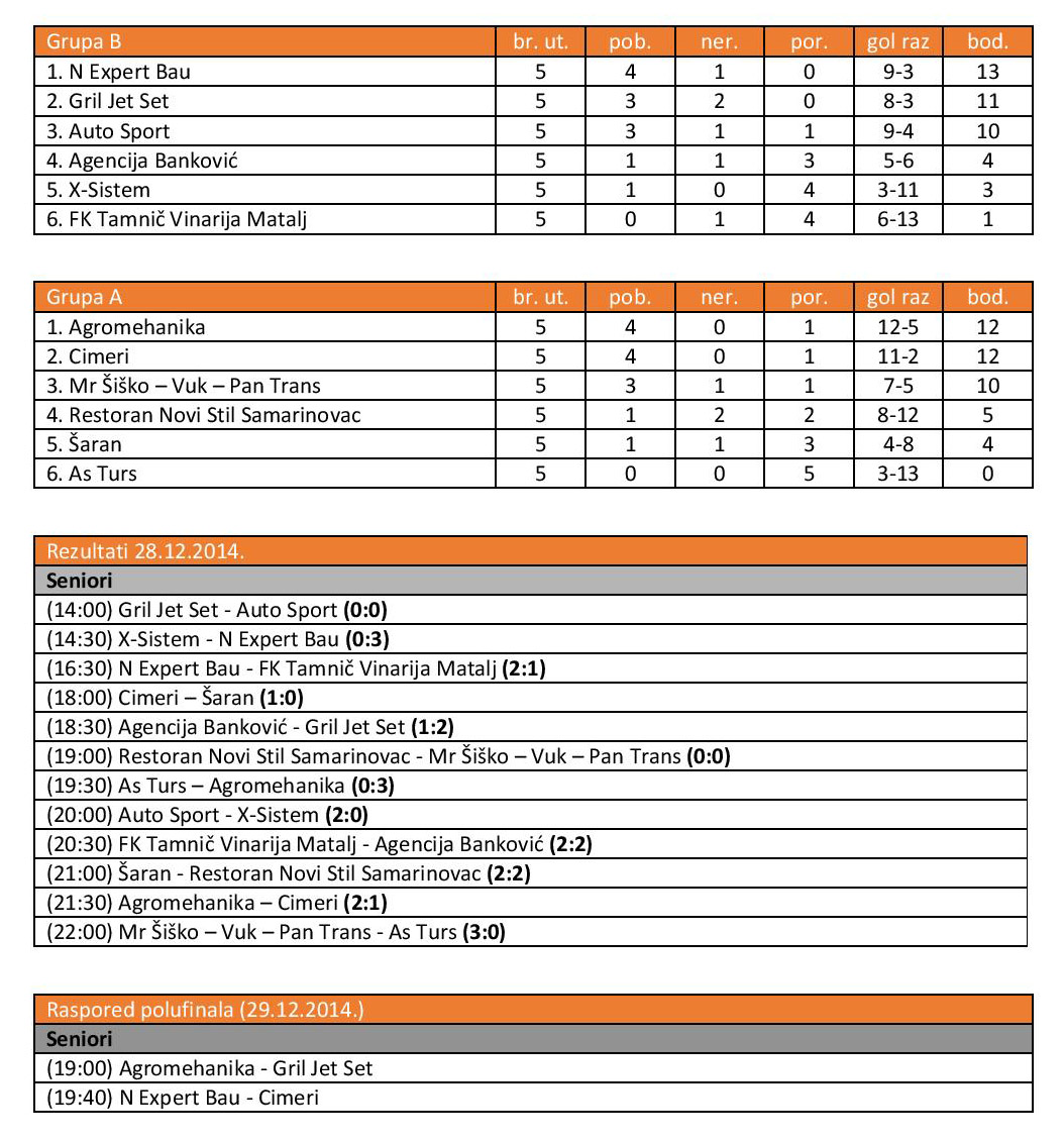 Evo kompletnog pregleda jučerašnjeg dana takmičenja u seniorskoj kategoriji, kao i konačnih tabela i rasporeda takmičenja za 29.12.2014.