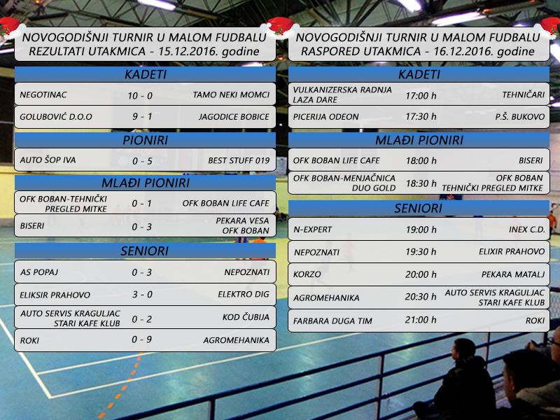 Rezultati prvog dana tradicionalnog novogodišnjeg turnira u malom fudbalu i najava programa utakmica za petak 16. decembar