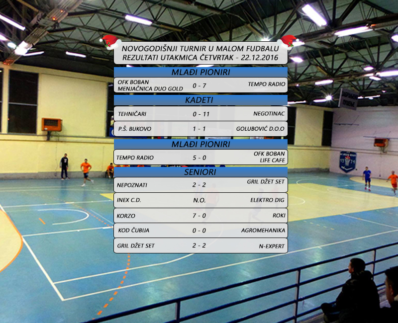 Autor East SideNakon utakmica sedmog dana Novogodišnjeg turnira u malom fudbalu, poznati su polufinalisti u kategoriji kadeta, pionira I mlađih pionira. Seniori sutra igraju odlučujuće utakmice.