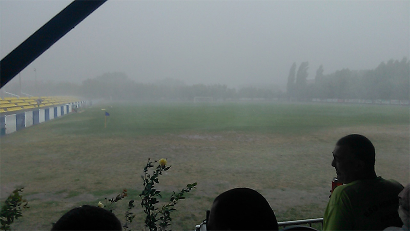 Sloga je imala dobru priliku u 15. minutu, kada je Vojinović šutirao iskosa sa desne strane, ali je Radenković bio siguran. Fudbaleri Hajduk Veljka su nakon toga još dva puta šutirali ka golu Dimitrijevića, ali bez rezultata. Nakon pola sata igre, sudija Vučković, bio je prinuđen da zbog jake kiše i grada, igrače obe ekipe pošalje u svlačionice, a pauza je potrajali petnaestak minuta.