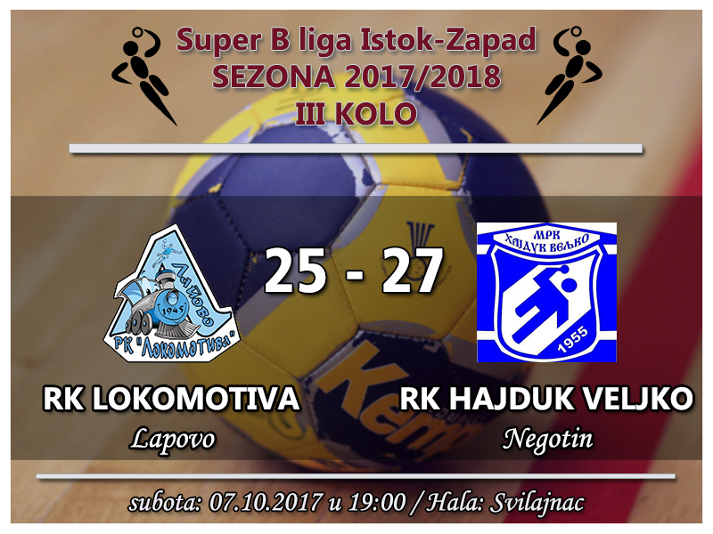 Dobro su rukometaši Hajduk Veljka otvorili utakmicu u Svilajncu, gde ekipa Lokomotive iz Lapova igra svoje utakmice kao domaćin. Već u petom minutu imali su tri gola prednosti, 4:1. Negotinski rukometaši hrabrom i srčanom igrom, stigli su do druge pobede u Super “B” ligi istok – zapad.