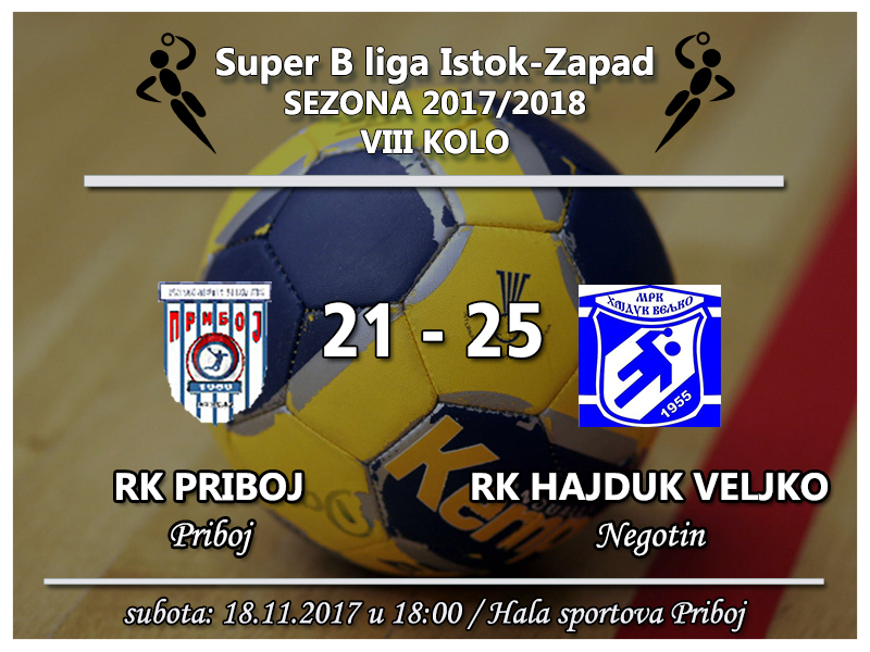 U 48. minutu bilo je 18:18 i to je bilo poslednje izjednačenje na utakmici, nakon koga su rukometaši Hajduk Veljka preuzeli vođstvo koje su uvećavali iz minuta u minut. U 51. minutu bilo je dva gola prednosti 18:20, a pet minuta kasnije već četiri, 19:23, pa je tada moglo da se nasluti kome će pripasti dva boda iz ove utakmice. U poslednja četiri minuta obe ekipe postigle su po dva gola, za konačnih Priboj – Hajduk Veljko 21:25.
