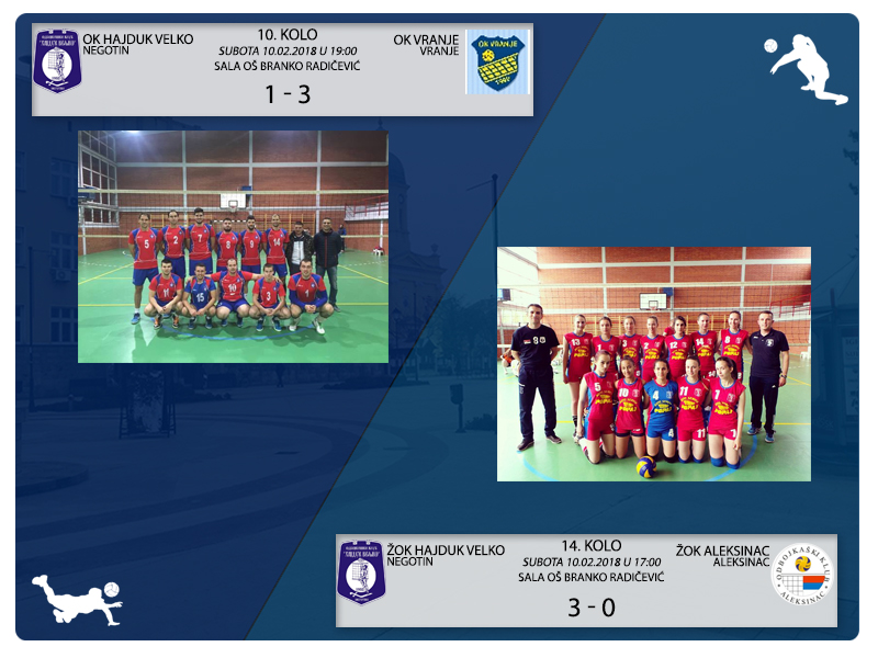 Autor Bojan ŽivanovićOdbojkašice Hajduk Veljka u 14. kolu Druge lige Istok savladale ekipu Aleksinca maksimalnim rezultatom 3:0 po setovima 25:16, 25:11, 25:13. Negotinski odbojkaši poraženi od Vranja rezultatom 1:3, po setovima 17:25, 22:25, 26:24, 21:25. Odbojkašice sa 16 bodova na sedmom mestu, a odbojkaši sa samo 3 boda na pretposlednjem.