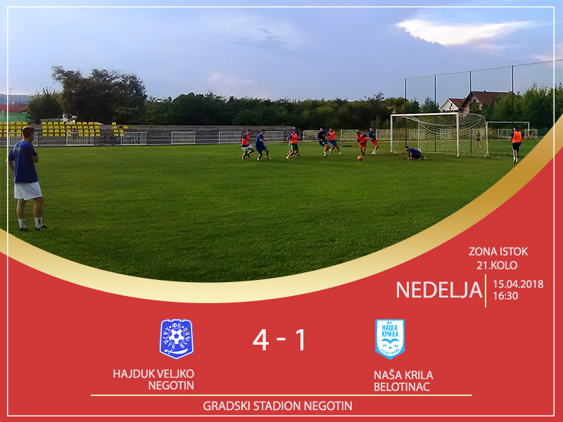Autor Bojan ŽivanovićFudbaleri Hajduk Veljka u 21. kolu Zone Istok savladali Naša krila 1936 iz Belotinca rezultatom 4:1. Dvostruki strelac Milan Jakovljević, po jedanput se u listu strelaca upisali Vučinić i Vujadinović . Hajduk Veljko na trećem mestu sa 39 bodova.