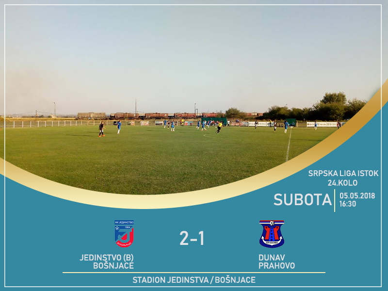 Autor Bojan ŽivanovićU 24. kolu Srpske lige Istok, prahovski Dunav poražen od Jedinstva u Bošnjacima sa 2:1. Jedini pogodak za prahovskog srpskoligaša postigao Dimitrijević u 68. minutu. Dunav i dalje na jedanaestom mestu sa 30 bodova. U narednom kolu Dunav će u Prahovu ugostiti ekipu Moravac Oriona iz Mrštana.