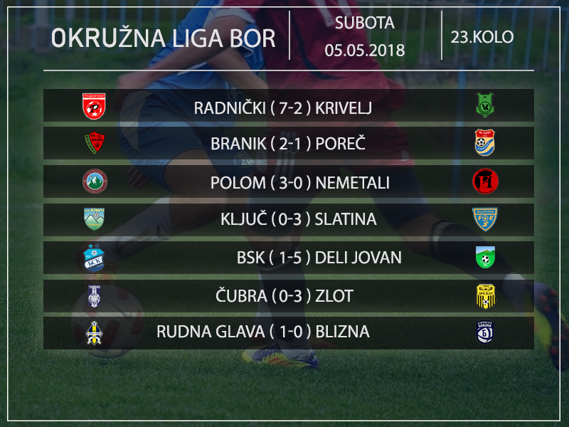 Autor Bojan ŽivanovićNa pet utakmica 23. kola Okružne lige Bor postignuta 22 gola. Najviše u Klokočevcu, u susretu Radničkog i Krivelja, čak 9, minimalac u Rudnoj glavi. Pobede Branika i Deli Jovana, poraz BSK-a. Čubra odustala od takmičenja.