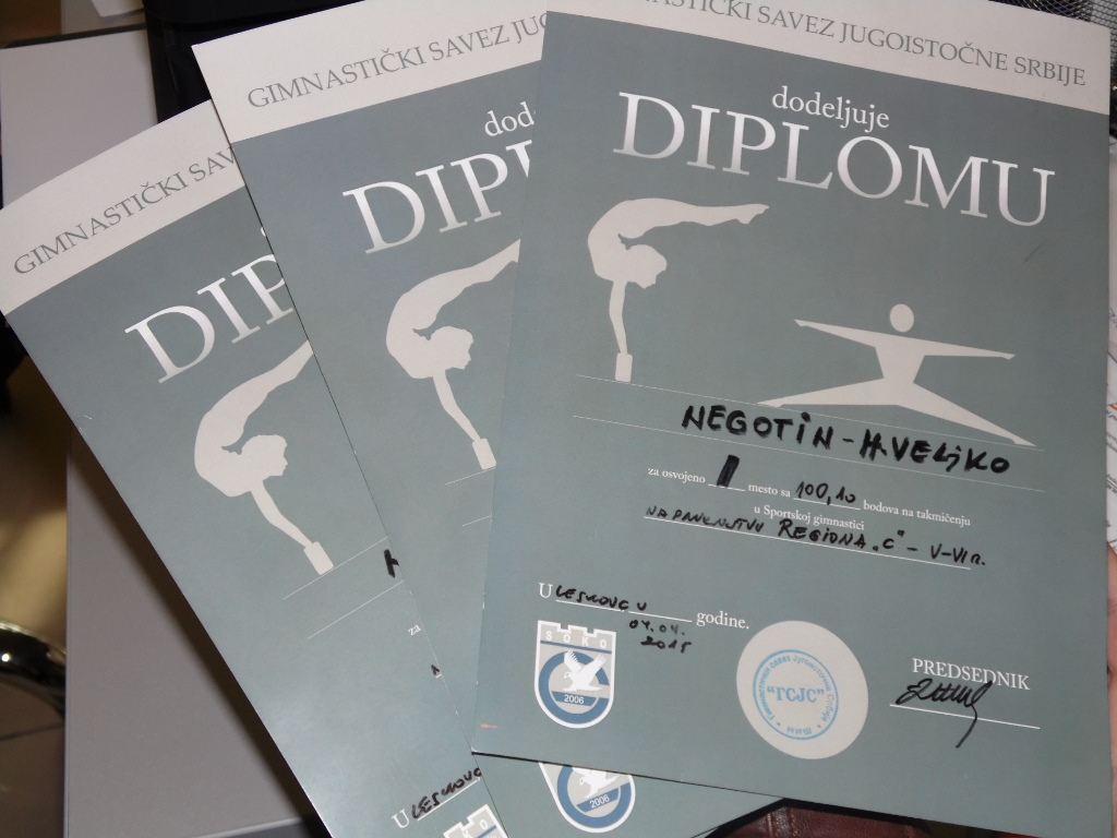 „Možemo se pohvaliti sledećim rezultatima... Najpre da krenem od ekipnog takmičenja u I kolu Jugoistočne Srbije u C i D programu u sportskoj gimnastici u kojoj smo osvojili tri odličja, dva prva mesta i jedno drugo. U pojedinačnoj konkurenciji osvojili smo tri prva mesta, dva druga i jedno treće i ovim uspesima izborili plasman u II kolo takmičenja. Ovo je već ogroman uspeh, s obzirom da smo mlad klub koji postoji tek godinu dana.“