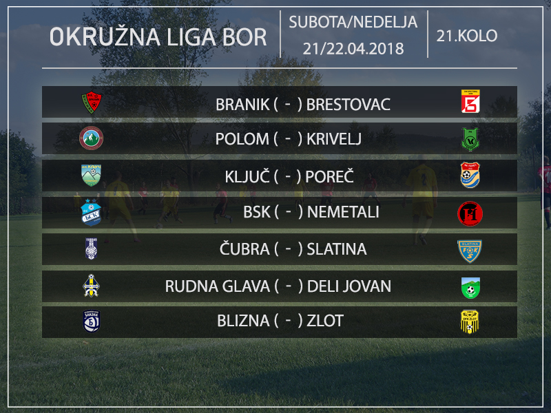 Na terenima Okružne lige Bor, danas i sutra igraju se utakmice 21. prvenstvenog kola. Derbi kola biće odigran u Štubiku, gde trećeplasirani Branik dočekuje drugoplasirani Brestovac. BSK dočekuje Nemetale, Čubra vodeću Slatinu, dok će Deli Jovan gostovati u Rudnoj glavi.