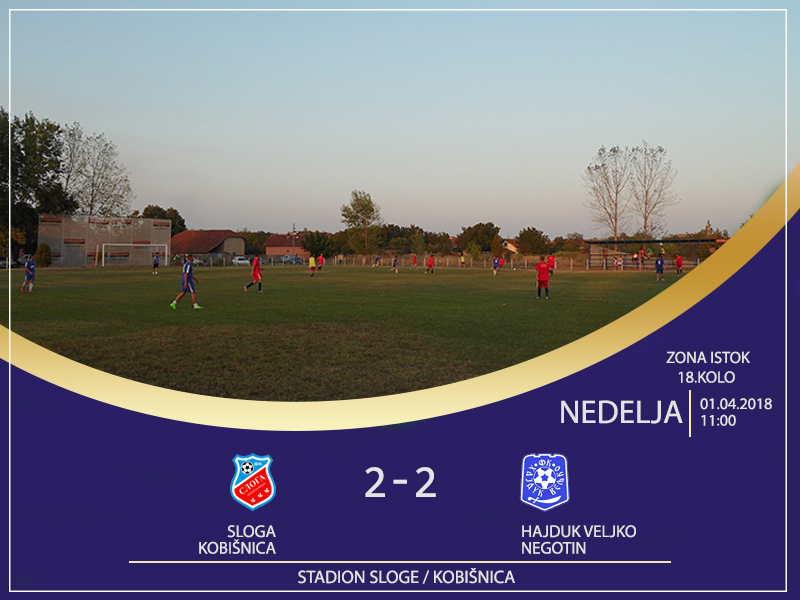 Fudbaleri Sloge iz Kobišnice i negotinskog Hajduk Veljka odigrali nerešeno 2:2, u utakmici 18. kola Zone Istok. Strelci Vojinović i Durgut za Slogu, Vujadinović i Bregovljanović za ekipu Hajduk Veljka. Zonaš iz Kobišnice sa 14 bodova i dalje na poslednjem mestu, a negotinski sa 31 bodom na trećem.