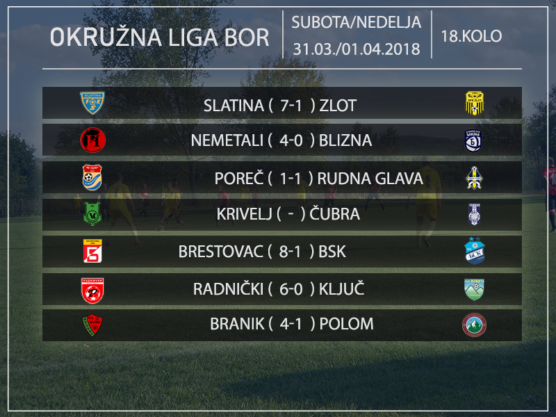 Na šest utakmica 18. Kola Okružne lige Bor postignuta 34 gola. Ubedljive pobede Brestovca, Slatine i Radničkog. Četvorke Branika i Nemetala. U sredu od 16 sati odložene utakmice 16. kola.